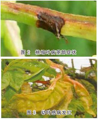 桃樹苗枝梢受害呈灰綠色或黃色,較正常枝條短,而且較粗腫,頂端葉片常叢生,發(fā)病嚴重時病枝逐漸向下枯死,甚至有的大枝枯死或全株枯死(圖2)。