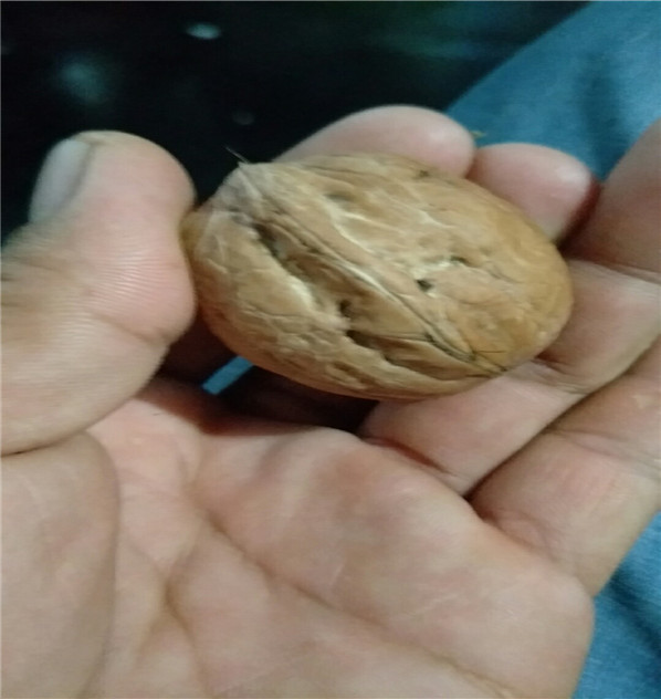 【魯光核桃苗】:堅果橢圓形,基部圓,果頂尖,單果重12.9克,殼面多淺溝,不太光滑;殼厚1.1毫米,易取整仁,核仁充實飽滿、色淺、味香而不澀;出仁率60.17%,產(chǎn)量高。